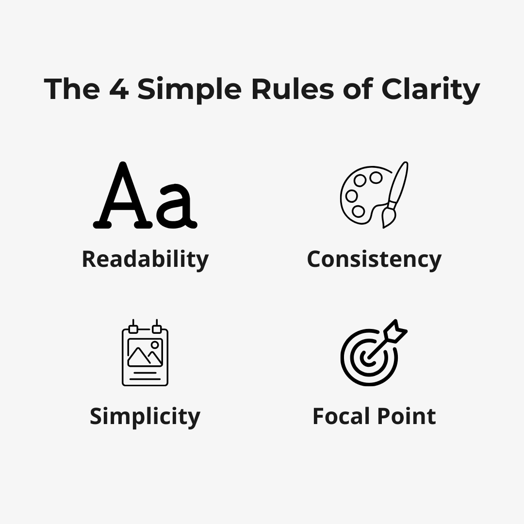 1. Readability is Everything: If they cannot read it, it failed. Use simple, clear fonts (maximum of two) and make sure your text has high contrast with the background (e.g., dark text on a light background).